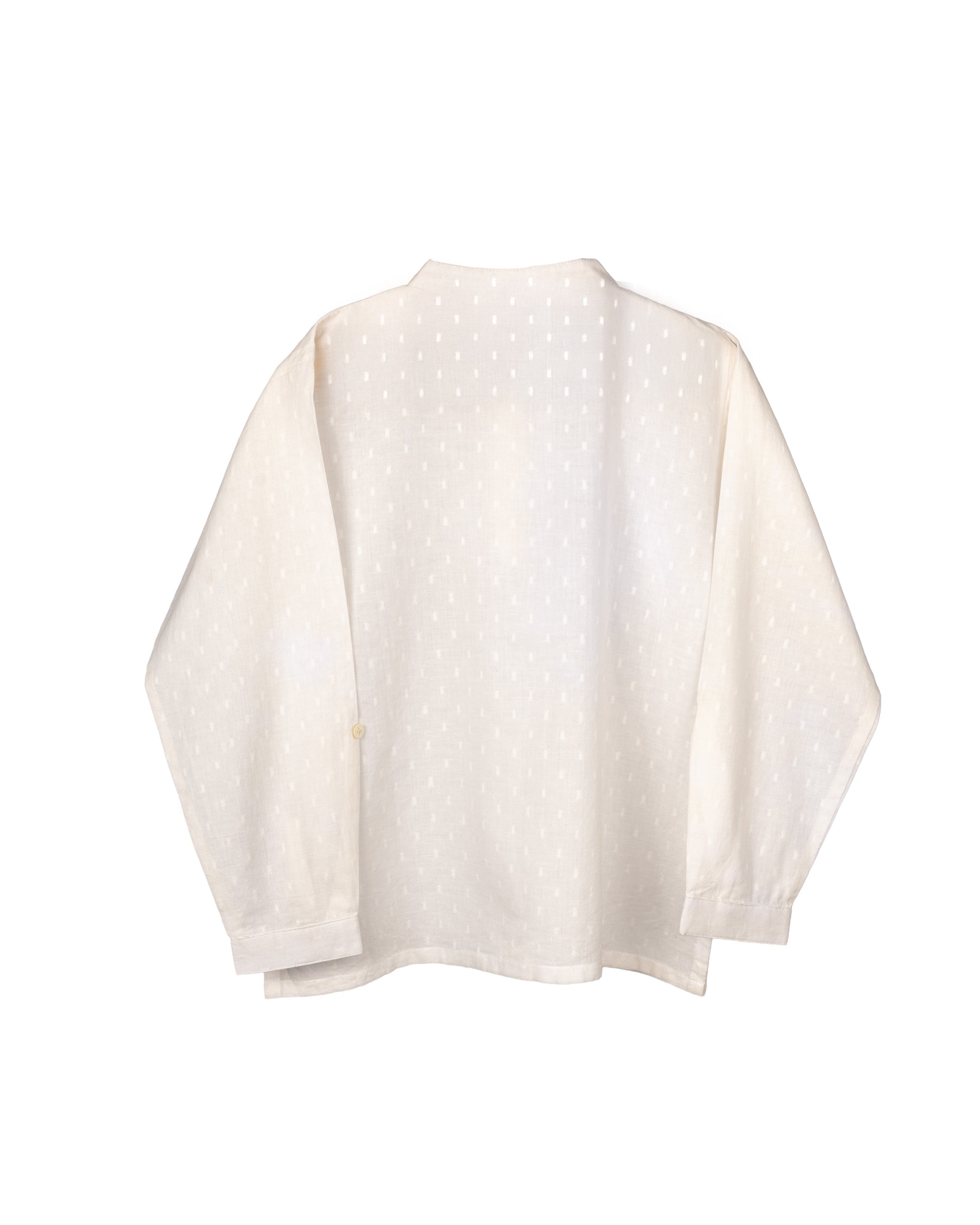 Soft mandarin neckline with minimal button detailing for ease