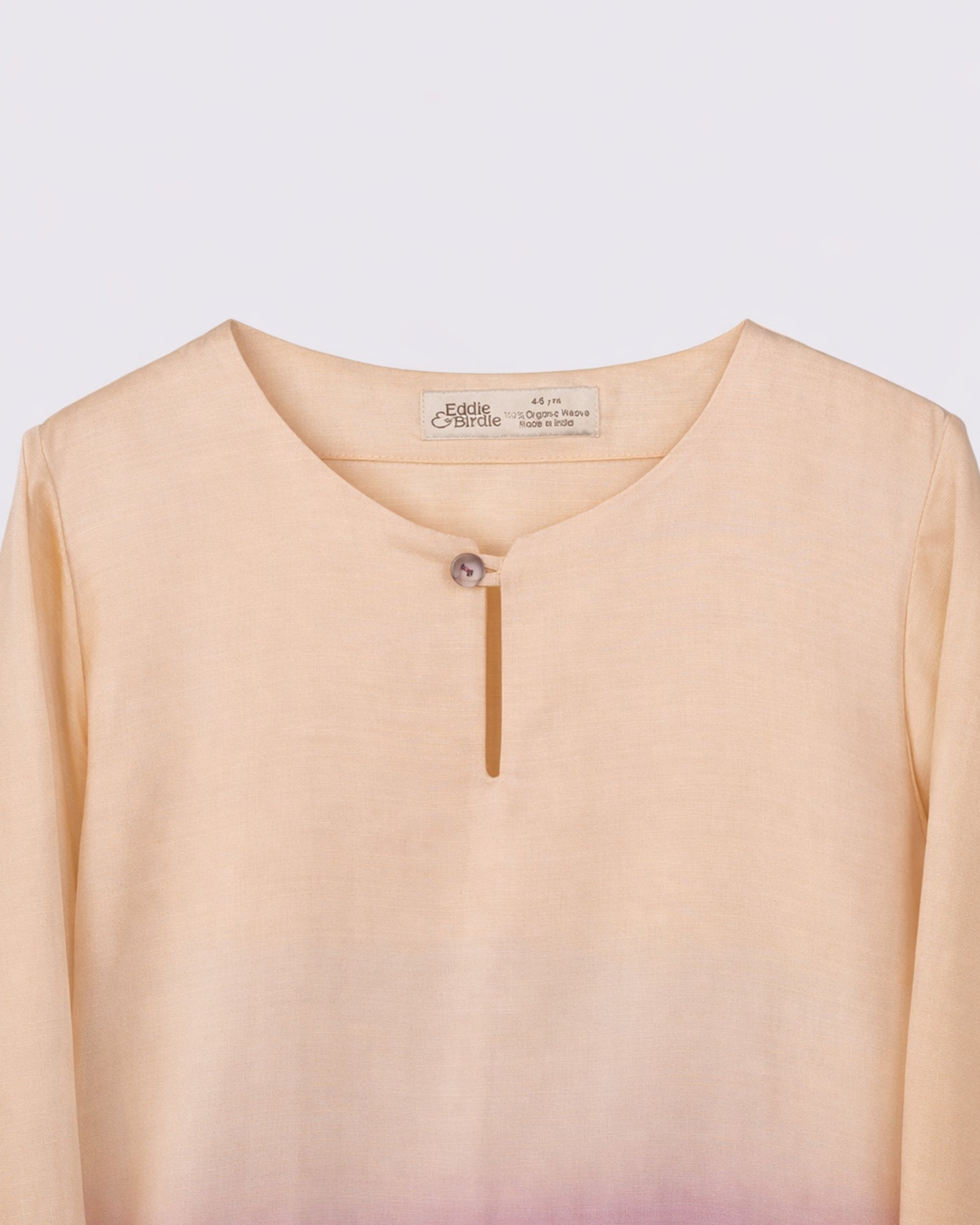Soft, serene, and thoughtfully crafted, this Eddie & Birdie kurta set features a delicate ombré transition from warm ivory to a rich, muted purple—evoking calm elegance with a touch of festive charm. Designed as a unisex silhouette, this piece celebrates fluid tradition and effortless style, making it a refined choice for children who embrace comfort with quiet sophistication